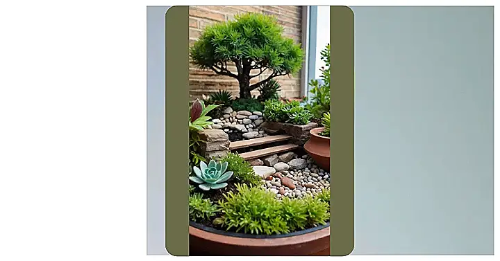 This miniature garden design is seriously adorable! Imagine being a tiny person – you’d have the coolest backyard ever, complete with a miniature bonsai tree that’s probably taller than you are! There’s a charming little stone bridge perfect for crossing the pebble stream, and enough succulents to start your own tiny cactus collection. It’s like a peaceful escape, all packed into one cute container – who needs a real garden when you can have this?