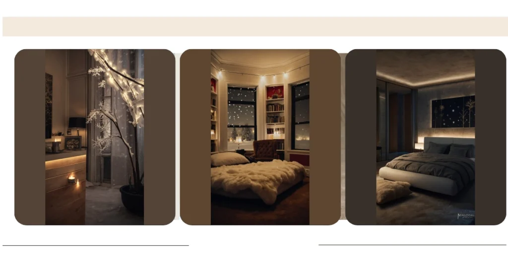 This bedroom looks like the perfect place to snuggle up on a cold winter day! The fluffy blankets and cozy pillows invite you to relax and escape from the chilly weather outside. You can almost hear the wind whistling through the trees and the snow gently falling outside, creating a peaceful and calming atmosphere. The twinkling lights add a touch of magic, making you feel like you’re in your very own winter wonderland.