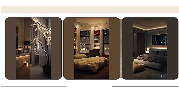 The twinkle lights add a magical touch, like something out of a fairy tale. And don’t even get me started on those furry throw pillows! They look so comfy, I’m ready to dive right in. It’s basically the definition of cozy, and perfect for a winter wonderland escape!