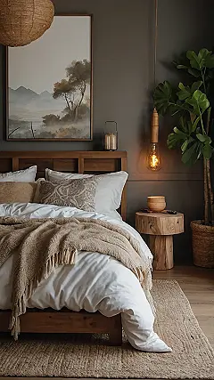 Seriously, who needs a rainforest when you’ve got this? Between the calming colors, the natural textures (hello, gorgeous wooden coffee table!), and those amazing lamps that look like they’re made of sunshine, this room is basically a hug. It’s the perfect spot to curl up with a good book (or your phone… we won’t judge!) and just relax. This is what dreams are made of—or, you know, what a perfectly cozy natural bedroom looks like.