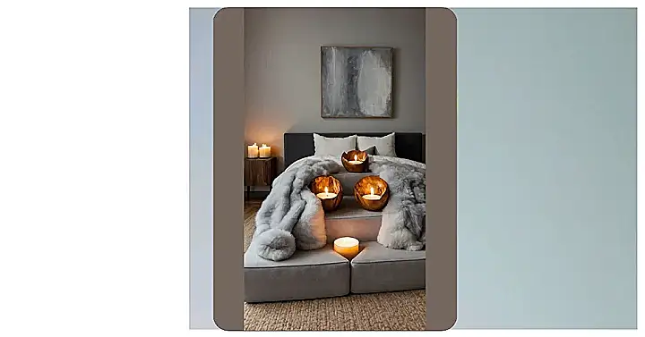 So, your living room needs a glow-up, huh? Take a peek at this setup! It’s got all the chill vibes with those furry blankets that look like they came straight from a fancy cloud. Then there are the candles, not just your regular birthday cake candles, but the kind that look like they’re chilling in wooden bowls. Imagine having this kind of cozy corner to Netflix and actually chill!