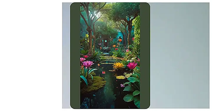 The image shows a magical pathway leading through a lush, green garden. It looks like the kind of place where fairies might dance and gnomes might hide. With its tall trees and winding path, this secret garden is a great place to get lost in your imagination. You can almost hear the birds singing and smell the flowers blooming. But be careful! There might be some friendly (or not so friendly) creatures lurking around.