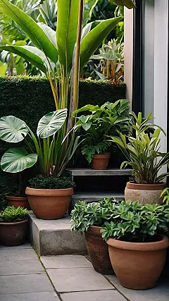 This picture shows a small tropical garden that’s bursting with life! It’s like a mini jungle right in your backyard. The different plants and flowers are all packed together in cute little pots, and they look so happy and healthy. It’s easy to imagine spending a relaxing afternoon in this little garden, surrounded by the sounds of nature and the scent of blooming flowers.