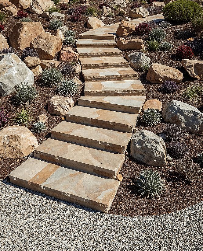 Transform challenging slopes into breathtaking features with these ingenious ‘rock garden steps’, a key element in ‘tiered landscaping sloped backyard’ designs. Natural stone ‘rock stairs outdoor’ create visual interest and seamless transitions.