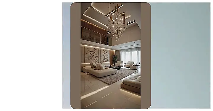 This living room is so fancy, it’s practically begging for a royal to come in and chill. It’s like stepping out of a magazine! You’ve got fluffy white couches that look like giant clouds, and a chandelier that’s practically a piece of art. It’s almost too nice to actually relax in, but who wouldn’t want to take a nap on one of those comfy-looking couches, surrounded by all that fancy stuff?
