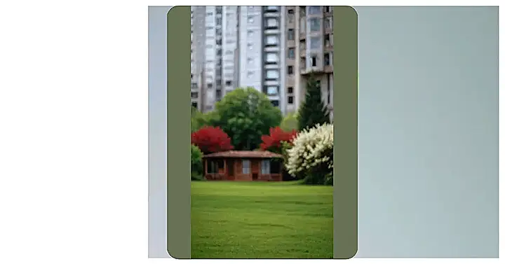 The picture shows a little cabin nestled among some trees, a splash of color in a world of grey. You can barely see the buildings behind it, all blurry and far away, like they’re trying to hide from the peace and quiet of the cabin. It’s like this little cabin is a secret hideaway, a place to escape the hustle and bustle of the city. Imagine yourself taking a break from all the noise and stress, kicking back on the porch with a good book and a glass of lemonade.