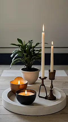 And get this – it’s all sitting on a tray, like a fancy breakfast-in-bed situation, but for your eyes. It’s the perfect way to make your living room look like it’s straight out of a magazine, without having to actually clean anything. Just light the candles, stare at the plant, and pretend you’re way more sophisticated than you actually are.