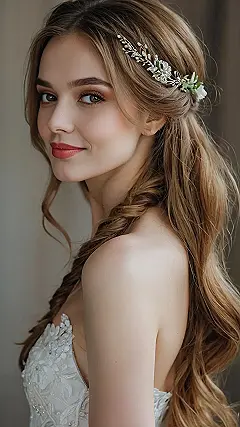 Planning your summer wedding hair? Don’t sweat it! This style is all about looking effortlessly gorgeous, even if you secretly spent hours in front of a mirror. The loose waves keep things cool and casual, perfect for dancing the night away without feeling like your head is a hot, heavy mess. Plus, that little braid and sparkly headpiece? Total bonus points for channeling your inner fairy princess without going full-on costume.