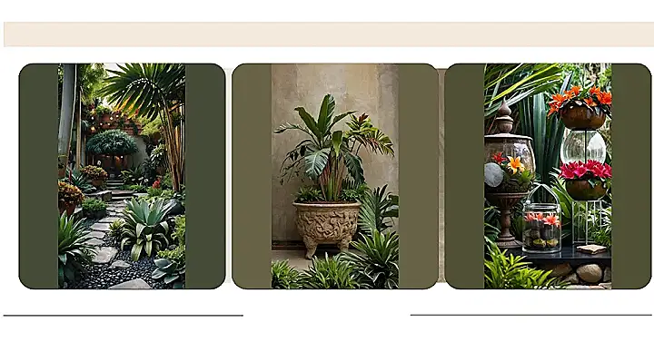 Wow, check out these amazing tropical plants! They’re like little jungle gardens in jars, each one a mini-vacation for your eyes. The bright orange and pink flowers pop against the lush green background, and the glass containers make them look like magical underwater scenes… except it’s totally above water and full of awesome plants! It’s like someone took a slice of a rainforest and put it on display, making it super easy to enjoy a bit of the tropics right at home.