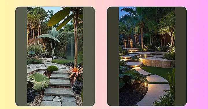 Picture this: It’s twilight, and you’re strolling along a gently curving pathway, the warm glow of little lights guiding your way through a lush tropical garden. Palm trees sway gently, their fronds almost whispering secrets. A little water feature gurgles softly nearby, adding to the peaceful vibe. It’s like stepping into a postcard – only way cooler because you can actually *feel* the soft grass between your toes and smell the sweet tropical air! This isn’t just a garden; it’s a mini-vacation in your own backyard!