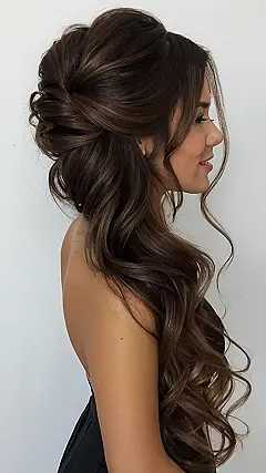 This hairstyle is seriously to-die-for! Imagine rocking this look on your wedding day – a stunning, romantic half-updo with loose, wavy curls cascading down your back. Those sparkly hair clips? They’re like tiny constellations adding extra magic to an already amazing ‘do. It’s the perfect blend of elegant and playful, making you feel like a total princess without being too fussy. It’s so drop-dead gorgeous, it’s practically guaranteed to make your wedding photos unforgettable.