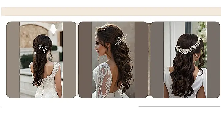 This hairstyle is seriously stunning! Imagine walking down the aisle with these luscious, wavy locks. It’s like a fairytale come to life, even better than Rapunzel’s hair (but maybe less likely to get tangled in a tower). That sparkly hair clip adds the perfect touch of “wow”—it’s like the hair version of a really good friendship bracelet, only way more glamorous. Definitely drop-dead gorgeous, right?