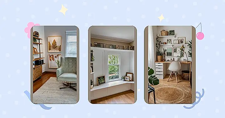Imagine acing that history assignment while chilling in this comfy chair. It’s like your very own thinking throne! This home office design mixes serious study vibes with a touch of nature. Who wouldn’t want to brainstorm ideas surrounded by leafy art and a view from the window?
