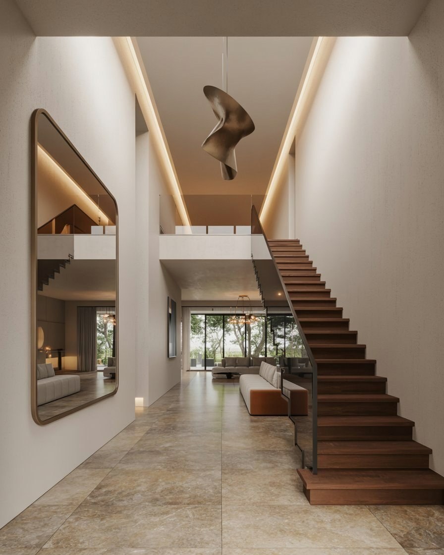 Make a striking first impression with this grand home entrance, featuring soaring ceilings and a dramatic floating staircase. The apartment entrance design blends modern architecture with warm wood and brushed metal accents for sophisticated appeal.