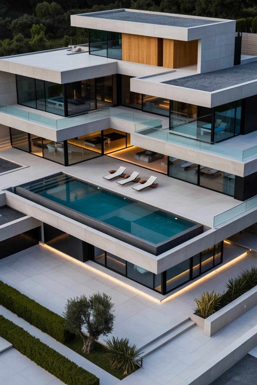 Discover breathtaking villa exterior design where modern architecture meets unparalleled luxury, crowned by a stunning rooftop swimming pool. Clean geometric volumes and cantilevered elements create a sculptural masterpiece.