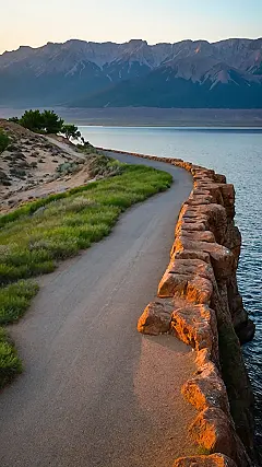 Imagine taking a stroll along this path – it’s like walking on the edge of the world, but way safer (probably). With the mountains in the background doing their best “majestic” impression and the water stretching out forever, it’s the kind of view that makes you forget your phone even exists… almost. Just be careful not to get too distracted by the awesome-ness and trip over those rocks, though!
