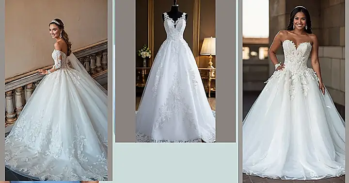 Planning your big day? Don’t forget the most important part – the dress! This one’s got all the princess vibes with its flowing skirt and fancy lace. The bride in the picture looks like she’s ready to waltz straight out of a fairytale. Just imagine twirling around the dance floor in this, feeling like a total queen…with or without a prince!