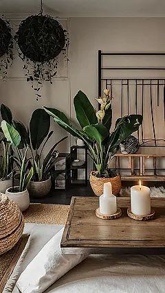 Imagine walking into a room that feels like a jungle, but in a totally chill and stylish way! That’s what this room is giving off. With all those plants, it’s like bringing the outdoors inside, which is super cool. And the candles? They add a cozy, warm glow, perfect for when you want to relax after a long day of school or just hang out with your friends.