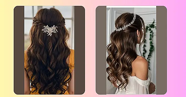 That hairstyle is seriously stunning! Just look at those luscious, wavy locks; it’s like a waterfall of chocolate, right? And that sparkly hairpiece? It’s like a tiny, beautiful crown for your big day. It’s the perfect mix of classic elegance and modern flair – totally timeless and definitely Instagram-worthy! You’ll be the most gorgeous bride ever, and your hair will be the envy of everyone there.