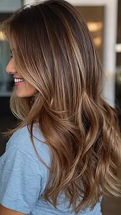 This picture is like looking into a magazine! The girl in the photo has those super-long, gorgeous waves. Her hair is a perfect blend of brown and blonde, kind of like a chocolate chip cookie with some sprinkles. It’s the kind of hair that makes you wish you could just run your fingers through it.