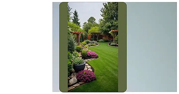 Imagine chilling in this backyard; it’s like stepping into a fairy tale! Seriously, the combination of the colorful flowers, the greenest-green lawn, and those cool stone pathways makes you wonder if tiny garden gnomes are busy keeping everything perfect. Just don’t be surprised if you see a unicorn grazing there someday – this garden is definitely magical.