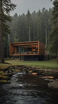This wood house design is seriously awesome! Imagine waking up to the misty sounds of a nearby river, surrounded by a whole forest of trees. It’s like living in a nature documentary, but instead of watching bears, you’re sipping coffee on your own private deck. The huge windows show off the amazing view, and the wooden structure blends perfectly with its surroundings—it’s practically invisible until you look closely. You’d totally be the envy of all your friends!