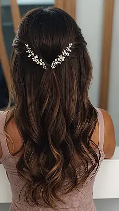 This hairstyle is totally perfect for a Hoco dance! It’s like something out of a fairytale, with those glittery hair clips that make you look like a princess. The curls are super dreamy too, giving you that “effortlessly gorgeous” vibe. Imagine rocking this look with a stunning outfit and dancing the night away, feeling confident and fabulous!
