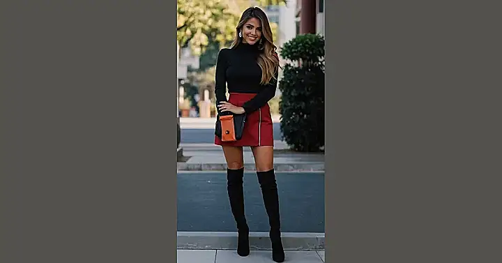 This outfit is giving us major fall vibes! She’s rocking a cute black turtleneck and those super trendy brown shorts with a chain belt. The best part? She’s got on some awesome thigh-high boots that are perfect for a cool autumn day. Let’s be real, those boots are practically begging to be paired with a pumpkin spice latte, right?