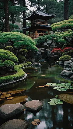 This picture looks like a Japanese Garden, right? It’s got all the things: lush green trees, a little pond, and lots of cool rocks. Imagine walking around here on a nice day, taking in the peaceful sounds of nature. It’s like the garden wants you to relax and forget about all your troubles! I bet if you were really quiet, you could hear the whispers of the wind in the trees. It’s pretty magical, honestly.