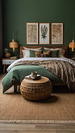 This bedroom is totally channeling some serious chill vibes from nature! Imagine waking up here, feeling like you’re sleeping in a fancy treehouse… but with more pillows. Everything from the leafy artwork to the woven light fixtures screams “earthy awesomeness.” Just try not to accidentally water the lamps, thinking they’re plants.