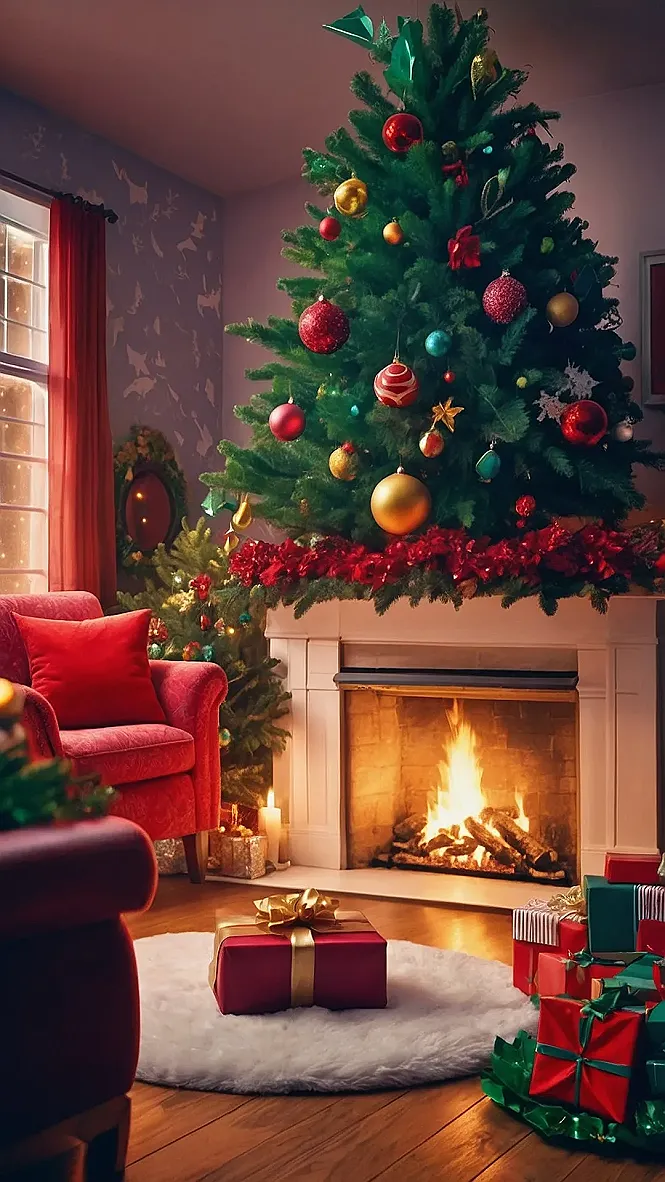 Imagine snuggling up on a comfy red couch, a roaring fire crackling in the hearth, and a giant Christmas tree shimmering with colorful ornaments. This picture is like a holiday dream come true – perfect for getting into the Christmas spirit!