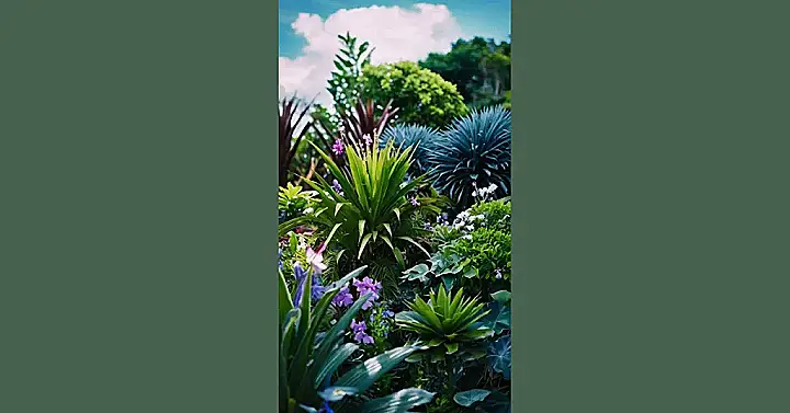 Wandering through this sun-kissed splendor, you can’t help but feel a deep appreciation for nature’s artistry. Each plant seems to tell a story, its unique shape and hue adding to the tapestry of this botanical wonderland. The air is alive with the hum of life β butterflies flit from flower to flower, bees buzz busily, and colorful birds dart among the branches. This tropical paradise is a living masterpiece, a celebration of the beauty and diversity of the natural world that invites you to slow down, breathe deeply, and immerse yourself in its serene embrace.