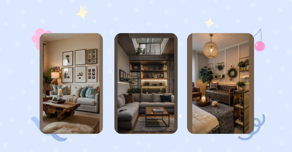 This room is like Pinterest exploded in the best possible way! From the gallery wall that’s basically an art museum (but way less stuffy) to the comfy-looking couch, it’s begging for movie nights and deep conversations. And that coffee table? It looks like a giant tree decided to become furniture, which is honestly the coolest thing ever.