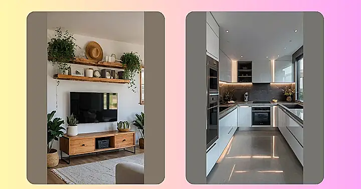Picture this: you’re chilling in your living room, ready to binge-watch your favorite show. Suddenly, your eyes are drawn to the shelves, not the TV! This room’s got serious style with those rustic shelves stacked above the tv. They’ve got plants cascading down like a jungle waterfall. It’s like the perfect mashup of nature and Netflix, except instead of bears jumping out, it’s just really cool decor.