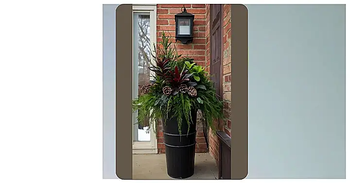 This planter is proof that even in the cold winter months, your front porch can be a cozy and inviting space! It’s overflowing with lush greenery, like the evergreen ferns and other hardy plants that are happy to brave the chill. And those funky brown pinecones? They’re the perfect touch of winter whimsy, reminding you that even though it’s cold outside, there’s still beauty to be found.