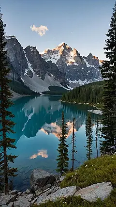 This picture is like nature’s way of showing off! Look at those mountains, they’re like the cool older siblings of hills, all rugged and covered in just a *tiny* bit of snow to look extra impressive. The trees are all lined up like they’re ready for a school photo, and the lake is so smooth, it could probably give a mirror a run for its money. Bet you could skip a rock pretty far across that water!