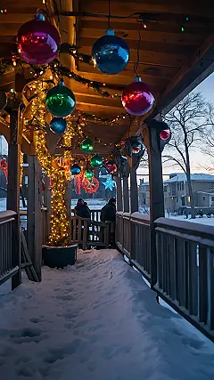 Picture this: It’s a chilly Christmas Eve, snow is softly falling, and you’re snuggled up on a porch, surrounded by twinkling lights and giant, colorful ornaments that look like they’re straight out of a candy shop! Those aren’t your average outdoor Christmas lights; these are serious statement pieces, hanging from a cozy wooden canopy, making this winter wonderland even more magical. It’s the kind of scene that makes you want to grab a mug of hot chocolate and just breathe in the festive air – maybe even sing a carol or two (off-key, of course, because that’s part of the fun!).