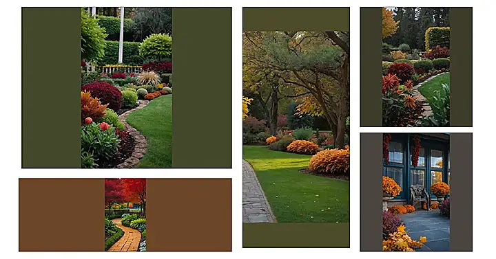 Imagine a beautiful garden with tall trees all dressed up for a fall party! They’ve got their finest colors on: deep reds, bright oranges, and sunshine yellows. The grass is like a soft green carpet, and there’s a cute brick path that winds through the trees like a little secret. You could almost get lost in this garden, but wouldn’t that be a delightful kind of lost?